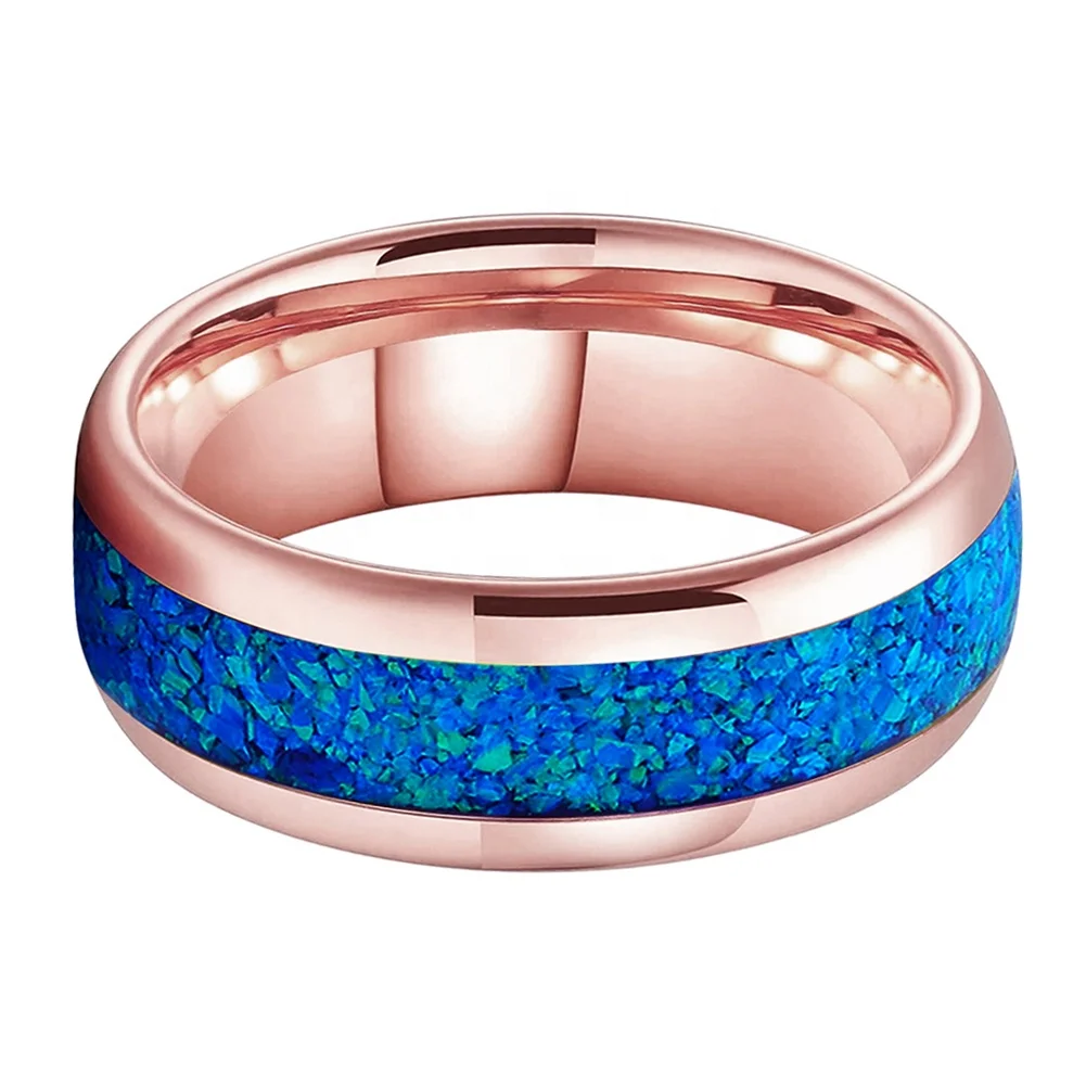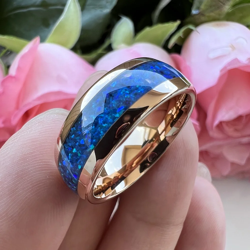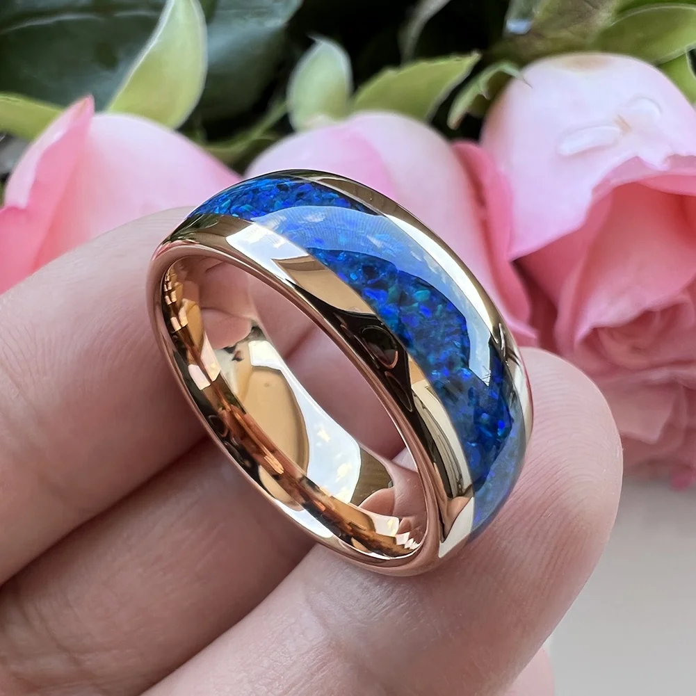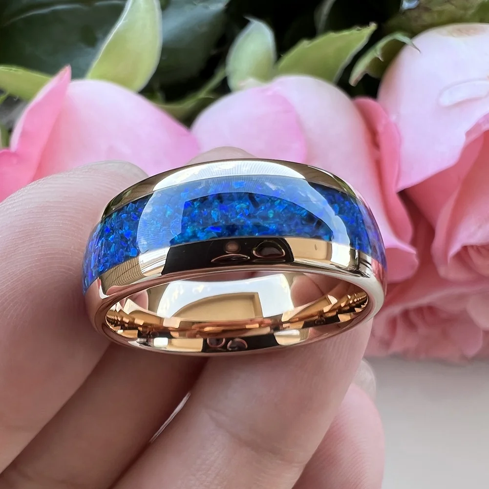 Coolstyle Jewelry 8mm Blue Opal Inlay Rose Gold Tungsten Carbide Ring for Men Women Fashion Engagement Wedding Band Comfort Fit